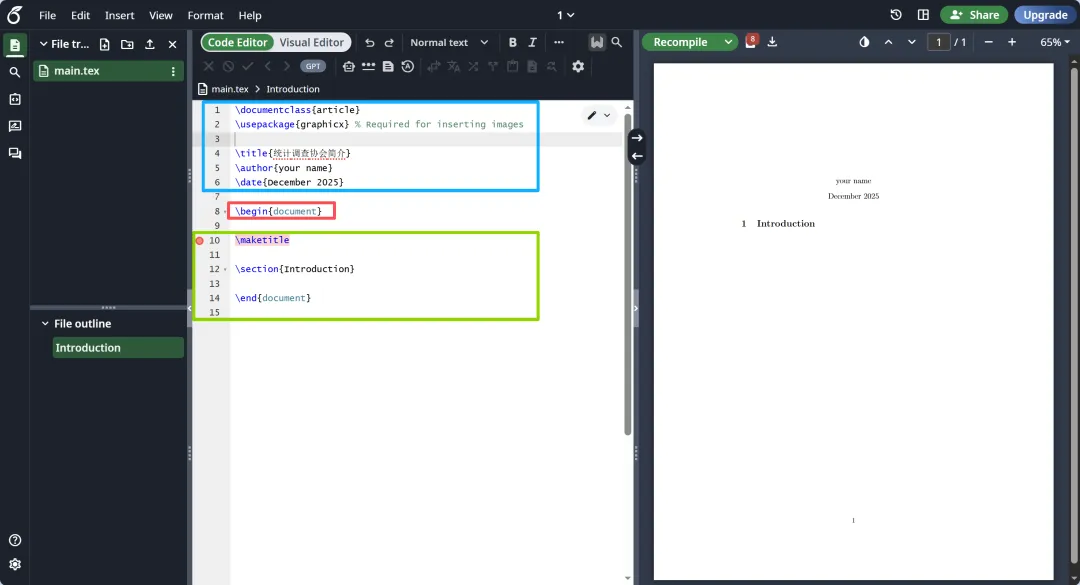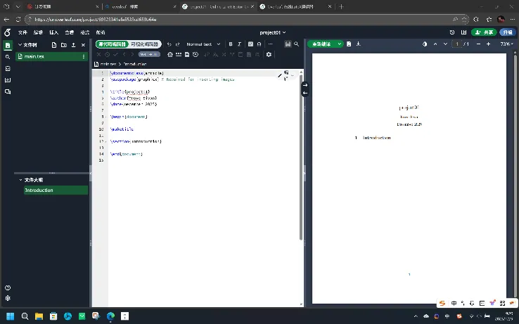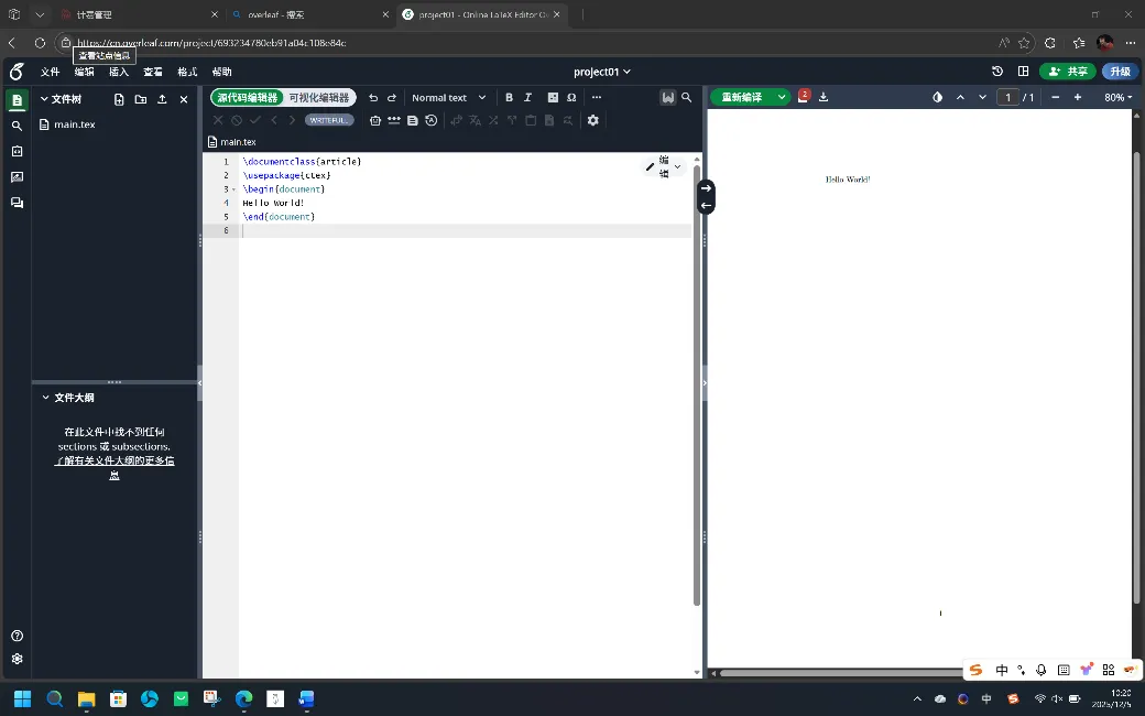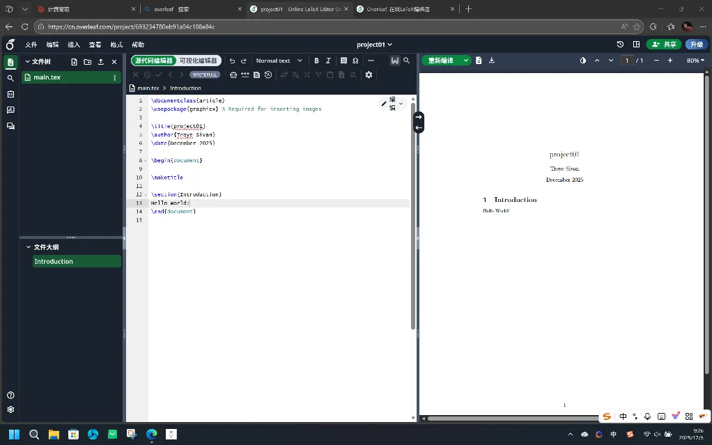 尝试输入一句简单代码,我们便完成了对于Overleaf的初步了解。