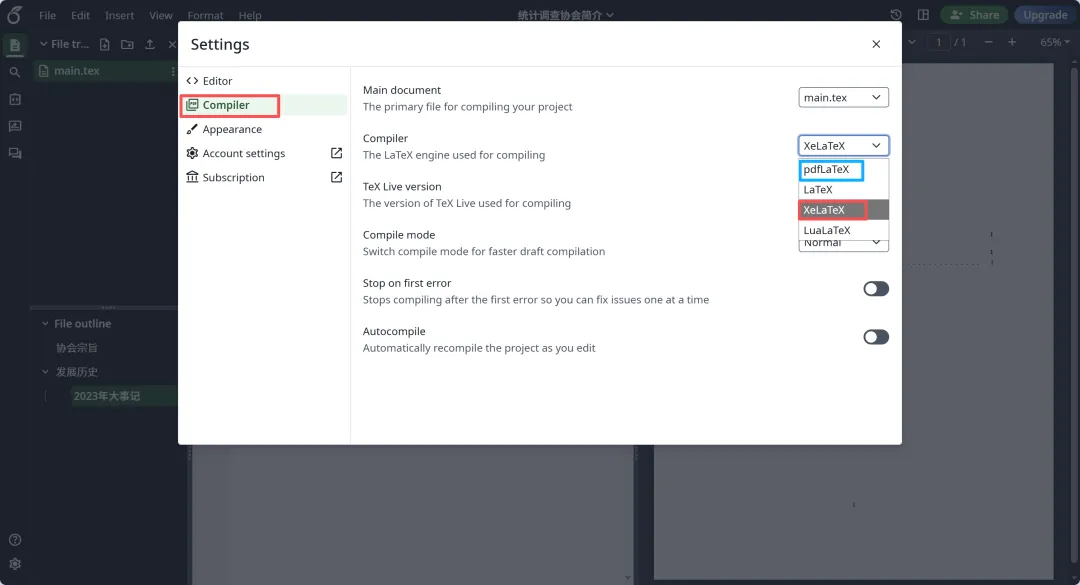 (2) 点击compiler,将默认的pdflatex换成xelatex,这样就可以了