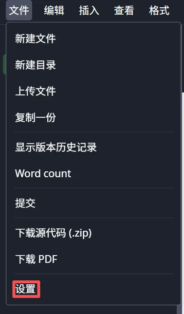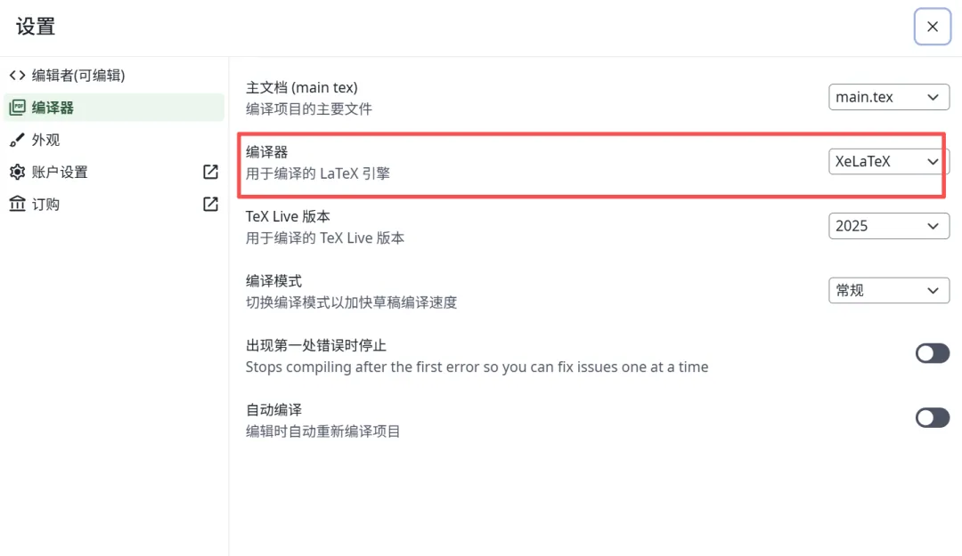 记得在文件→设置中选择 XeLaTeX(推荐)或 LuaLaTeX