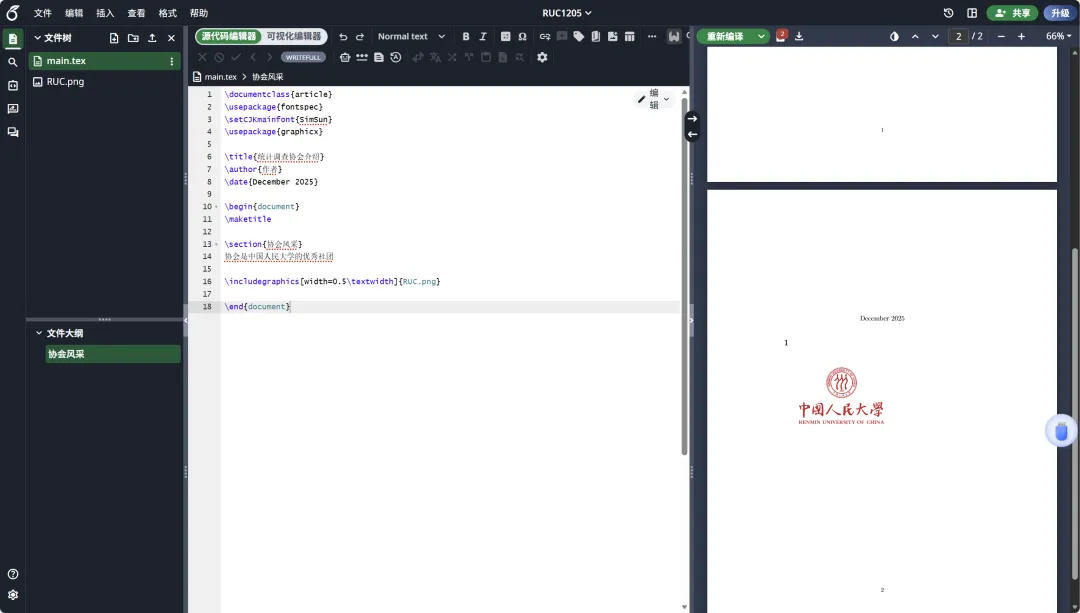 写完代码后点击绿色的 重新编译 按钮,右侧预览区就能看到清晰的校徽啦!如果想调整图片大小,只需修改width里的数值,比如改成0.8\textwidth就是页面宽度的 80%。