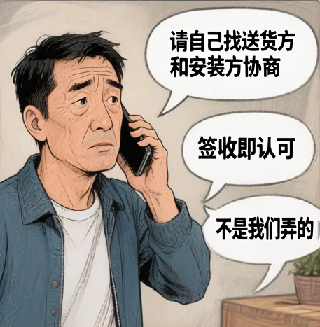 王先生联系客服,客服让他自己找送货方和安装方协商。送货方说“签收即认可”,安装方说“不是我们弄的”。来回扯皮一个多星期,王先生无奈自费返厂维修。