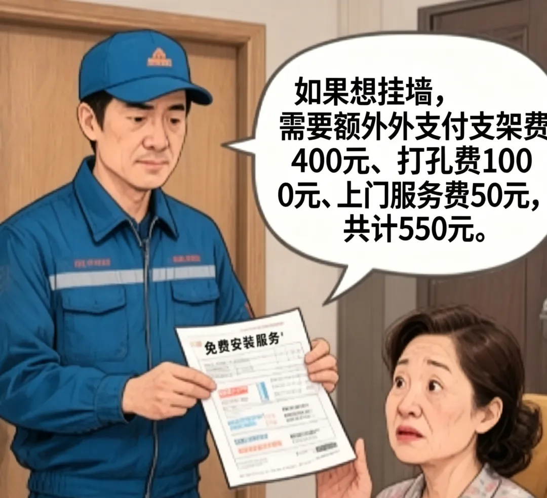 下单前把所有费用问清楚:挂墙要不要加钱?支架能不能自备?打孔怎么收费?有没有其他隐形费用?最好截图留证,拒绝任何形式的“现场加价”。