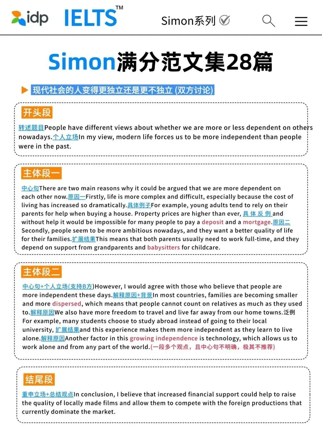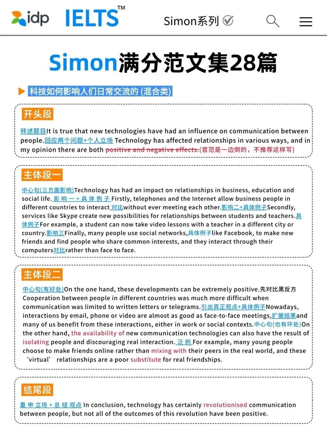 不仅给出了高分范文,还在文中标出了各类高频替换词、逻辑连接词等