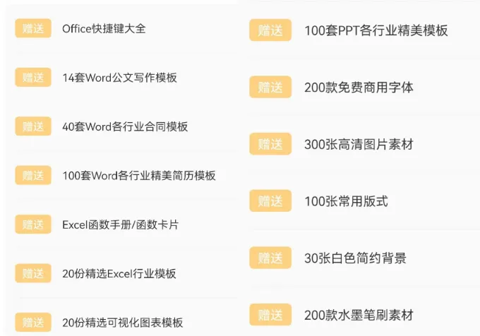 真正实用的Office办公资料礼包,涵盖Office快捷键大全、公文写作模板、Excel函数手册、PPT行业的精选模板、PPT字体素材包等,都是拿来即用的精选内容。