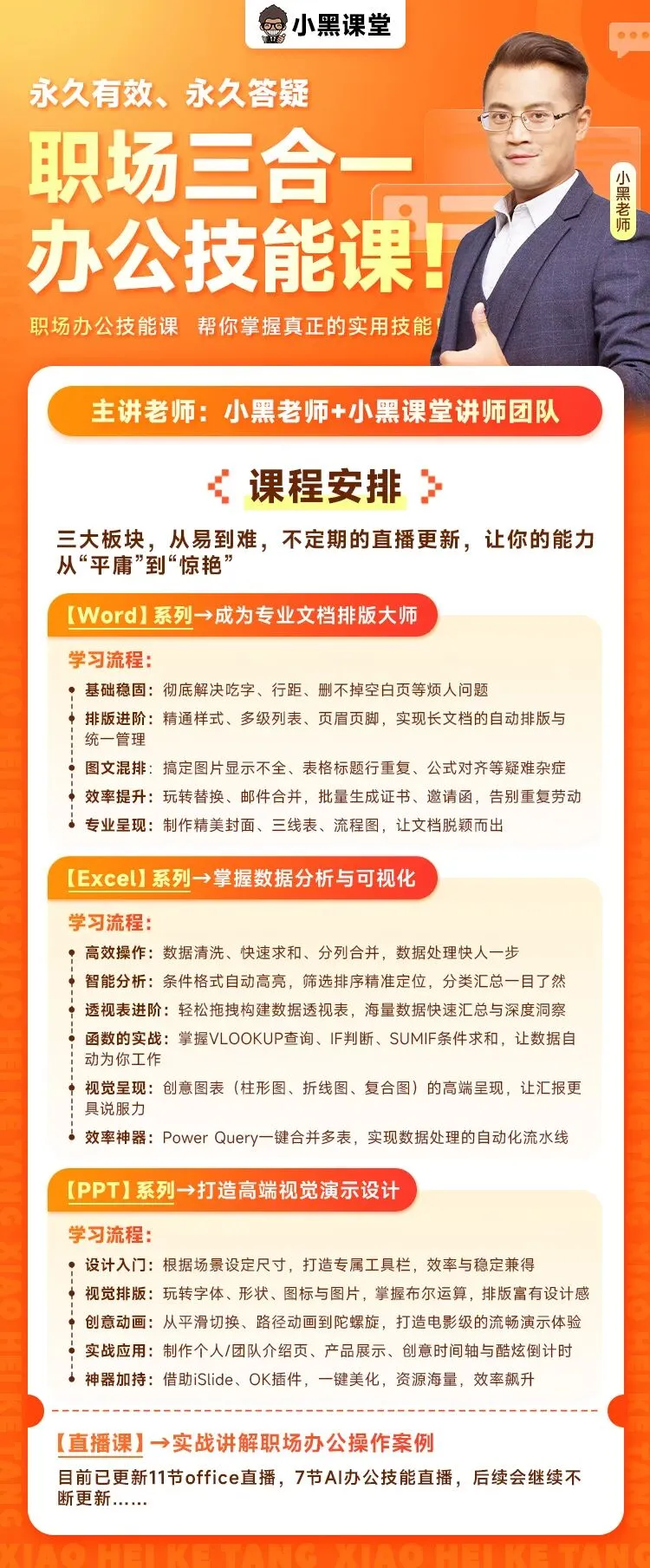 三合一系列课程涵盖Word、Excel、PPT三大软件,190节以上的视频录播视频,由小黑老师亲自录制,让你在轻松有趣的氛围中掌握基础和技巧。