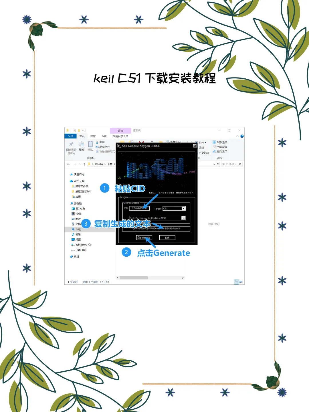 4. 生成密钥:Target 选择C51,粘贴 CID 码后点击Generate复制生成的授权码。