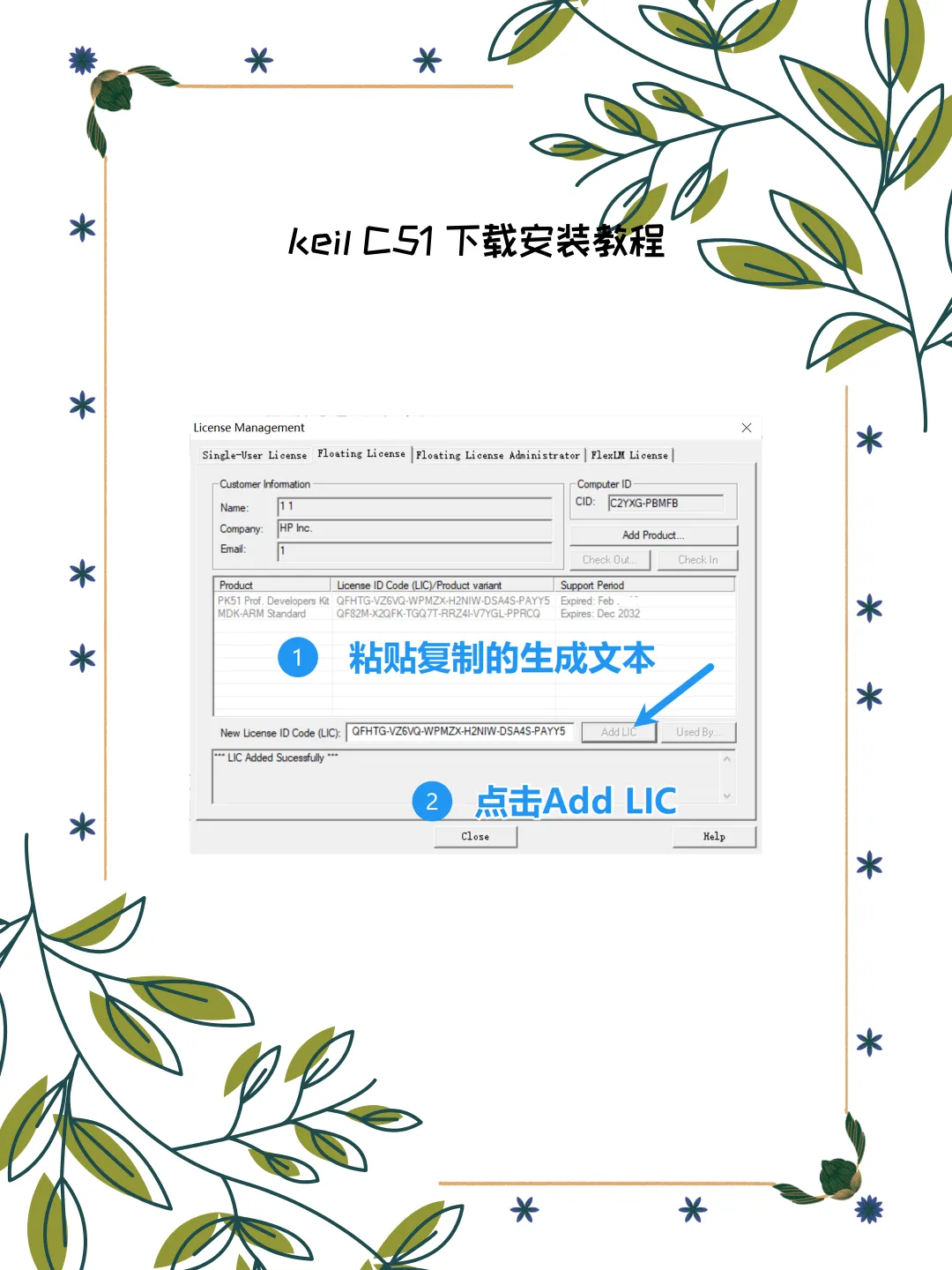 5. 导入验证:回到 Keil 授权窗口,粘贴至New License ID Code并点击Add LIC。