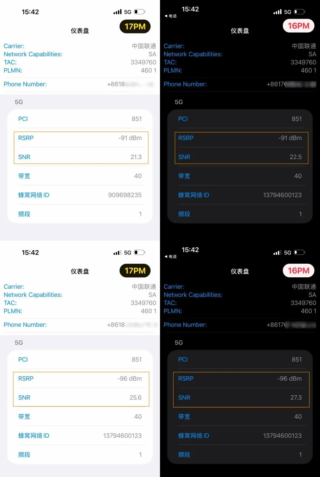 有网友反馈更新后信号体验有所提升,但实际测试显示,在同一环境下,iOS 26.4.1 正式版(16 Pro Max)与 26.5 Beta 3(17 Pro Max)的 5G 信号 RSRP 接收功率与 SNR 信噪比无显著差异。