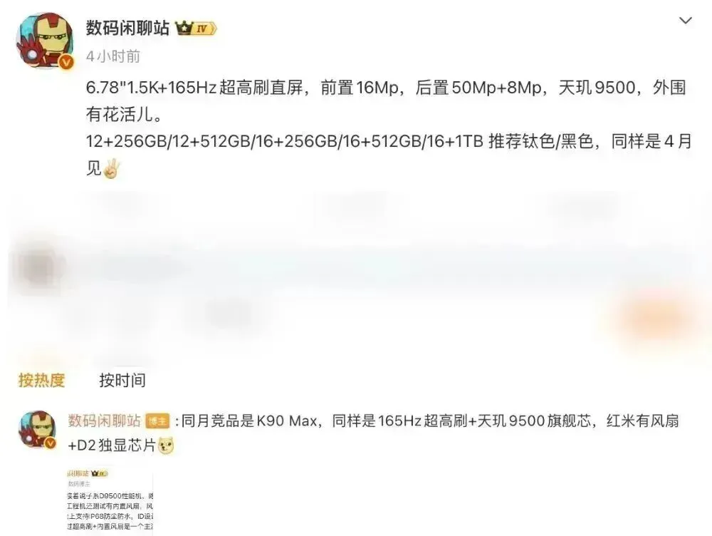 该博主还表示:“同月竞品为红米K90 Max,同样具备165Hz超高刷和天玑9500旗舰芯片,红米还配有风扇和D2独显芯片。”