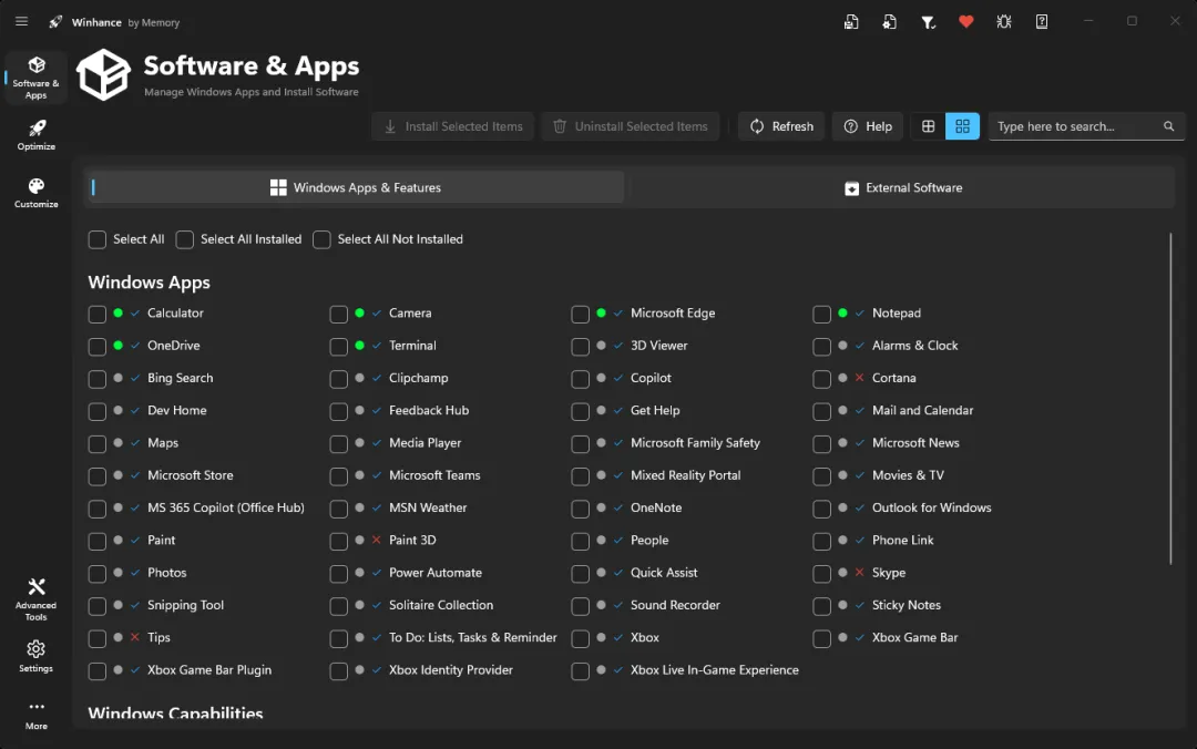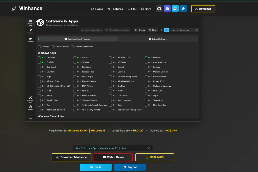 Winhance是一款专为Windows 10 和Windows 11设计的开源免费系统增强与优化工具箱,采用C语言开发,以图形化界面、零门槛优化、无捆绑无广告为核心特点,有效解决了Windows系统臃肿、卡顿和设置繁琐等问题。