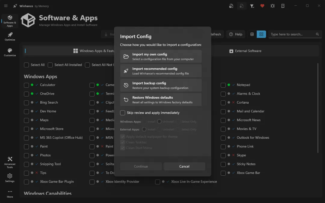 • 导出配置 • 将所有当前的 Winhance 设置保存到配置文件中 • 导入配置 • 导入您自己的自定义配置文件,或应用 Winhance 推荐的配置,即可轻松精简系统并进行优化。