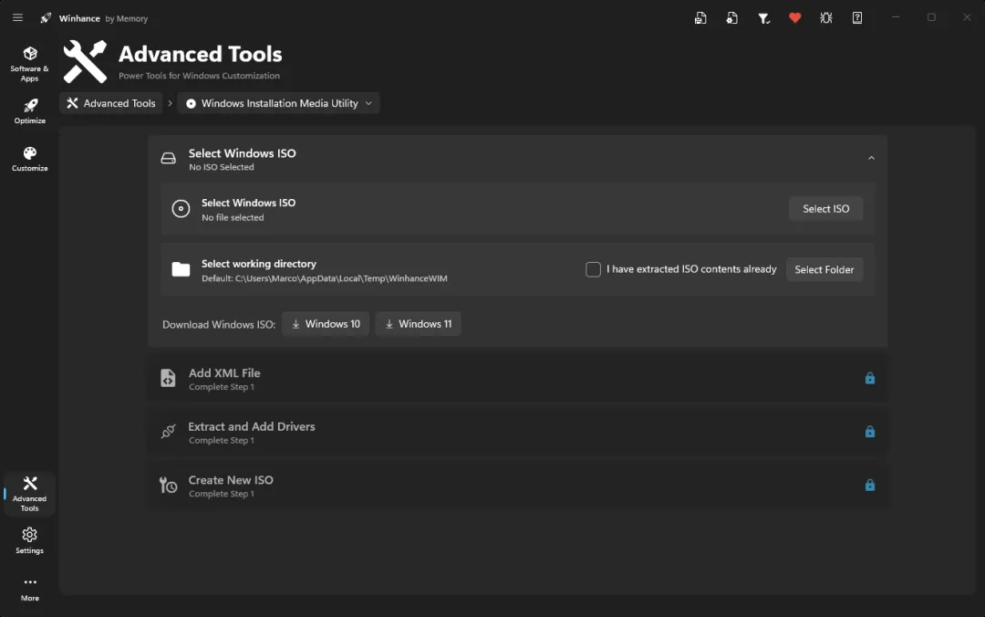 • WIMUtil-Windows安装媒体实用程序• 创建包含 autounattend.xml和集成驱动程序的自定义Windows ISO镜像• Autounattend.xml生成器• 根据您在 Winhance中的当前选择,自动生成安装文件