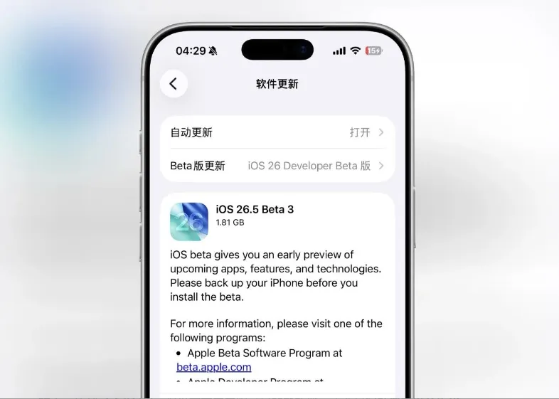 本次 iOS 26.5 Beta 3 更新包大小约1.81GB,没有新增任何面向用户的功能,核心以bug 修复 + 流畅度优化为主。