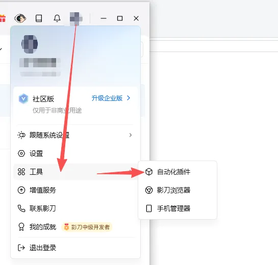 1. 打开影刀RPA软件。 2. 点击左上角的用户头像,在下拉菜单中选择 “设置”(或部分版本中的 “工具” )。