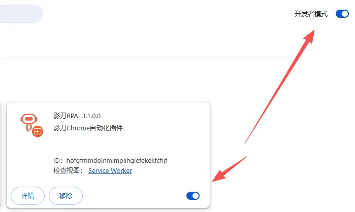 ◦ 右上角的“开发者模式”:将其切换为开启状态。 ◦ “影刀RPA”插件的开关:在扩展列表中找到名为“影刀”的插件,确保其处于启用(蓝色)状态。