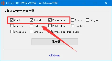 3、弹出如下图的界面,选择【Word】,【Excel】和【PowerPoint】即可,然后点击【一键安装】。