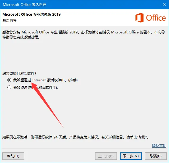 如果您的电脑弹出了如下图一样的【激活向导】页面,那么您只需要点击【我希望通过Internet激活软件】,然后点击【下一步】。