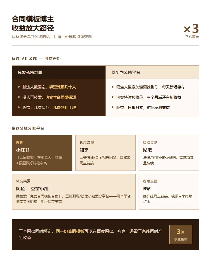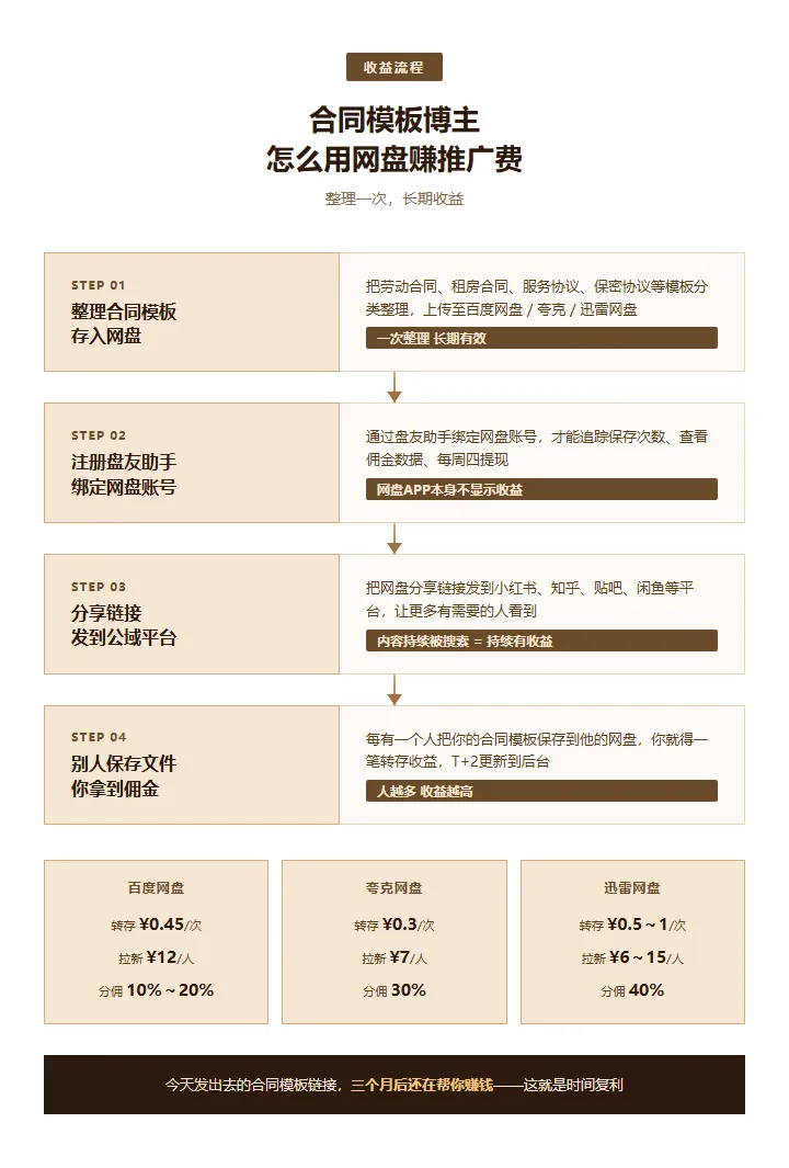 我在帮别人下载合同模板的时候,顺手赚了一笔钱标题写得清楚——劳动合同、租房合同、借款协议、服务合同、股权协议……大部分人不想付钱,但搜索到的免费版本又质量参差不齐我整理的这批是从律所拿来的规范版本,格式对,条款全我数了一下,那一批合同模板链接带来的转存收益,加起来有小几十转存收益是什么意思——就是别人把你分享的文件保存到他自己的网盘里,每发生一次,你就得一笔钱百度网盘是¥0.45/次,夸克是¥0.3/次,迅雷是¥0.5~1/次我现在后台能看到的数据——今天有人保存了一份借款协议,昨天有人下了一份劳务合同他们是从小红书、知乎、闲鱼、贴吧搜到我的分享链接的老内容持续被搜索到,今天发出去的东西,三个月后还在帮你赚钱四、 网盘拉新的逻辑,我第一次听到的时候也觉得奇怪你帮它带来一个从没用过这个网盘的人,它就付你一笔推广费百度网盘是¥12/人,夸克是¥7/人,迅雷是¥6~15/人除了带新用户,老用户每次保存你的文件,你也有收益——就是上面说的转存收益具体的数字会在盘友助手后台显示,T+2更新,每周四可以提现刚开始做的时候一天就是饭钱,做顺手了之后,一天稳定大几百,偶尔破四位数如果你本来就在整理合同协议模板、分享法律文书,或者手头有一批资源没有充分利用注册后,在「盘友助手」公众号后台回复【教程】领取完整推广教程
