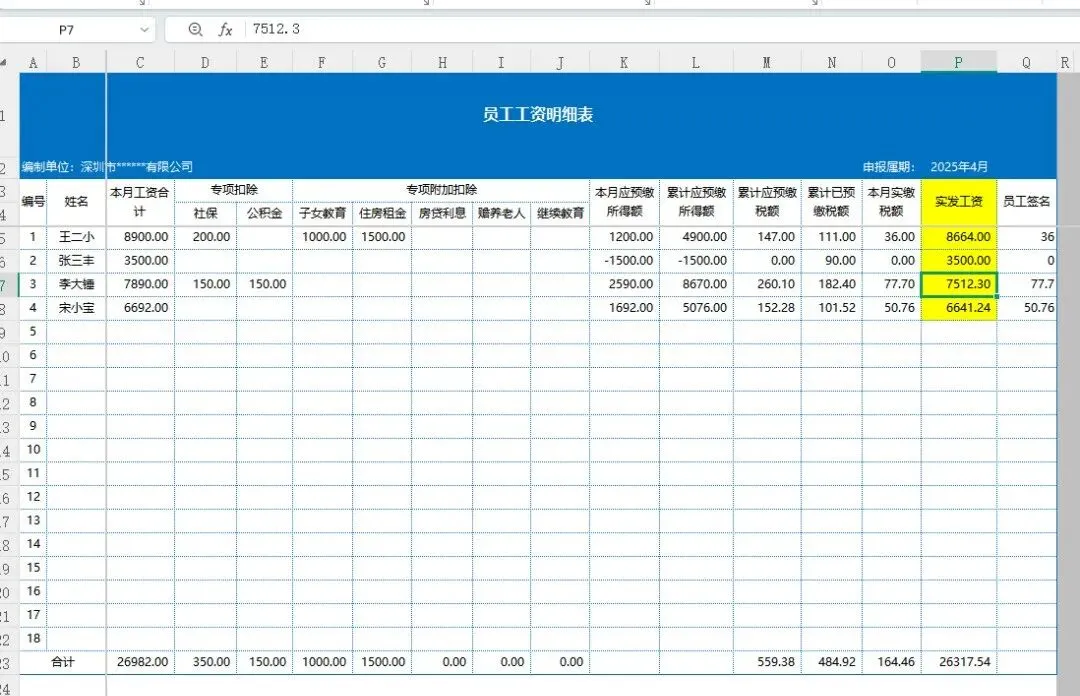 小企业财务人员必备的工资个税计算表模板,都提前设置好了个税计算函数公式与最新个税税率及个税专项附加扣除标准,只需要带入基础的财务数据即可自动算出结果,套用很方便。也不怕出错了!下面是新个税工资表操作界面展示,有兴趣的可以看看。