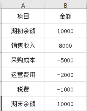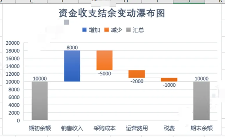 最终结余=10000 + 8000 - 5000 - 2000 - 1000 = 10000,中间增减柱悬浮衔接,完整展示资金从期初→增收→各项支出→最终结余的完整流动变化,一眼看懂每一项对资金的影响。记得关注我:表格一分钟;明天我们学习组合图!明天我们一分钟见~