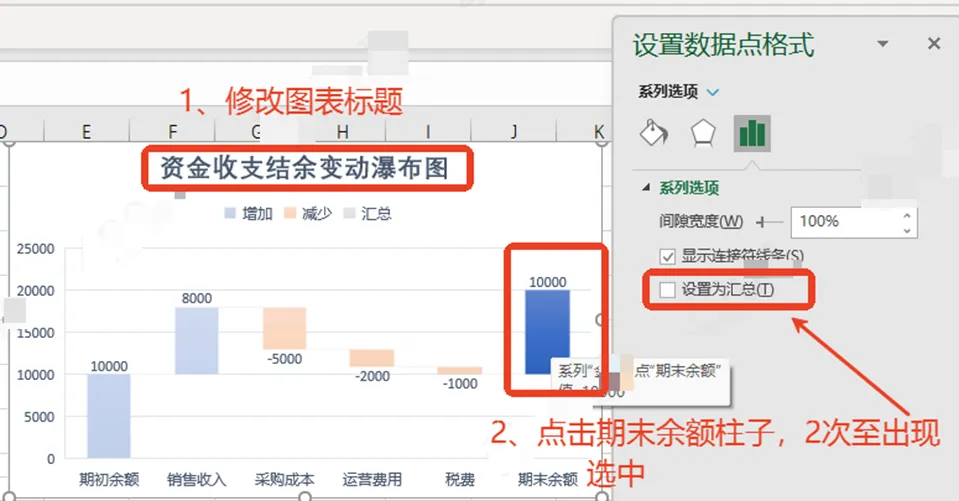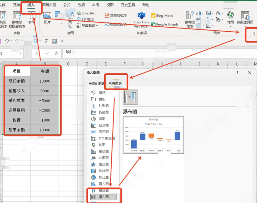 瀑布图作用:直观展示每一步的增减、累计变化,以及各因素对最终结果的贡献。