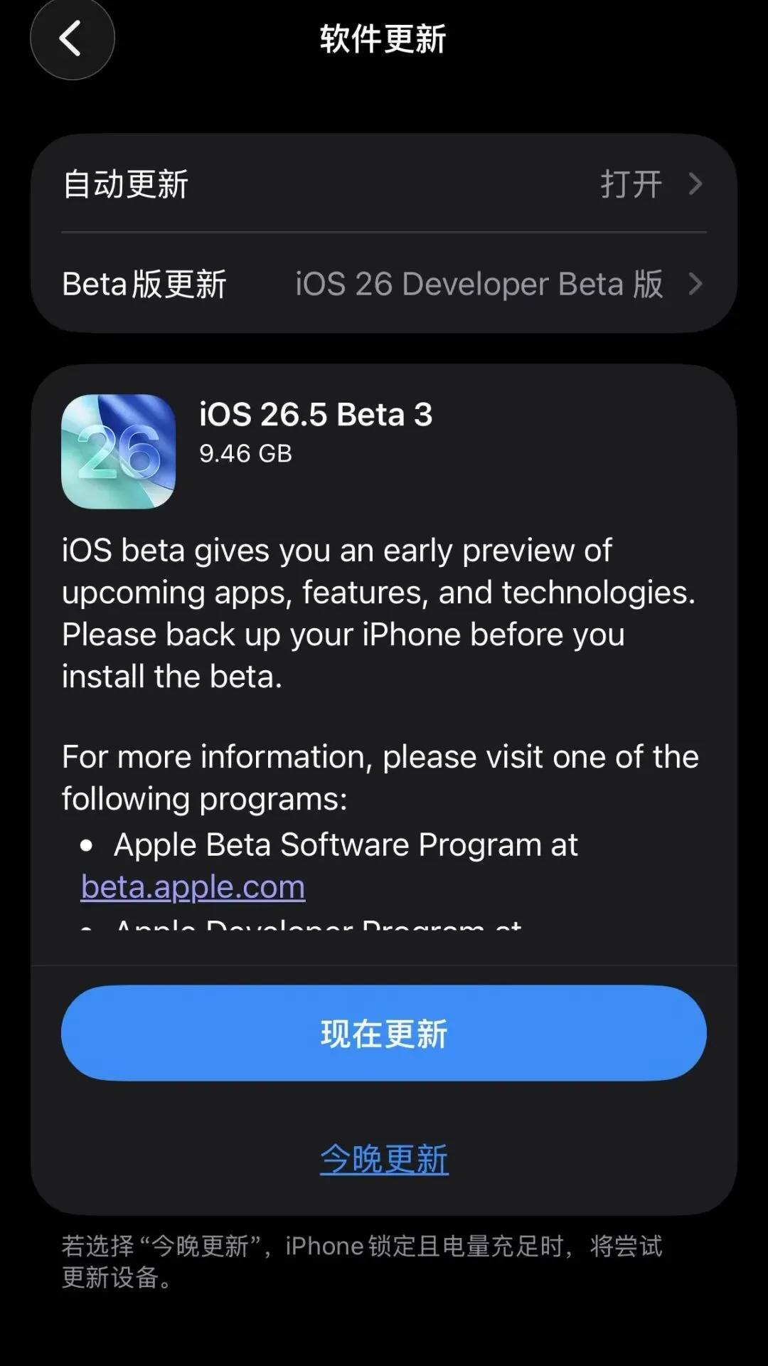 若尚未收到26.5 Beta 3更新,无需频繁刷新,静候苹果的分批推送即可;