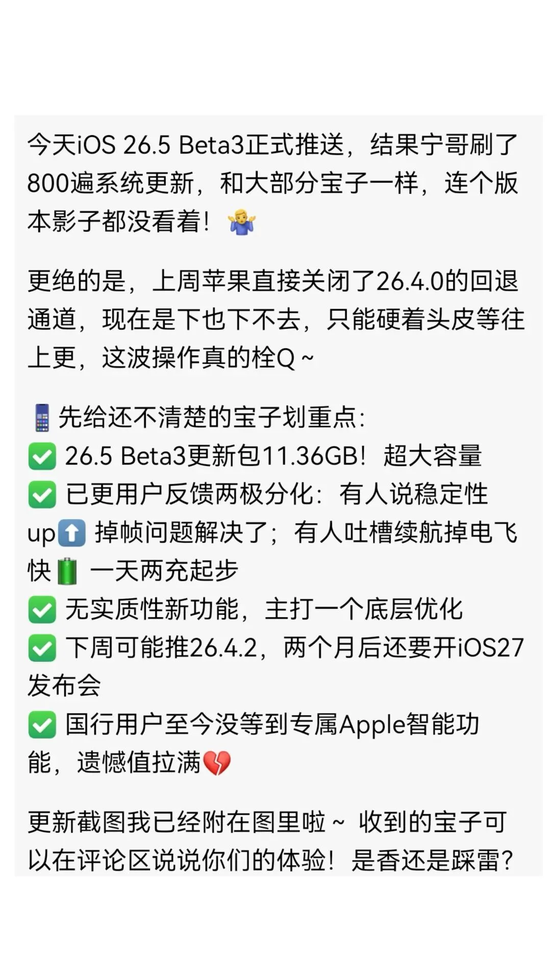 - 用户反馈:已更新用户对26.5 Beta 3评价两极,部分认为系统稳定性提升、掉帧问题改善;也有用户吐槽续航掉电加速,且无实质性新功能。