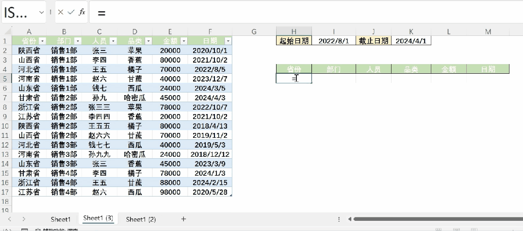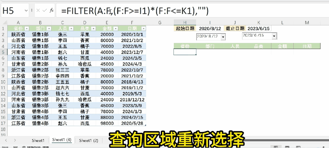 在H5单元格输入函数公式=FILTER(A:F,(F:F>=I1)*(F:F<=K1),""),如下图