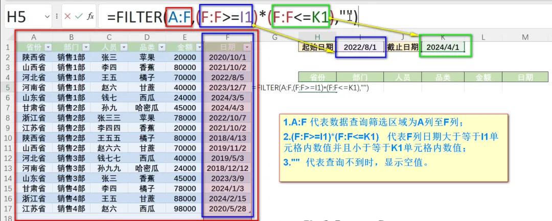 A:F 代表数据查询筛选区域为A列至F列; (F:F>=I1)*(F:F<=K1) 代表F列日期大于等于I1单元格内数值并且小于等于K1单元格内数值; "" 代表查询不到时,显示空值。