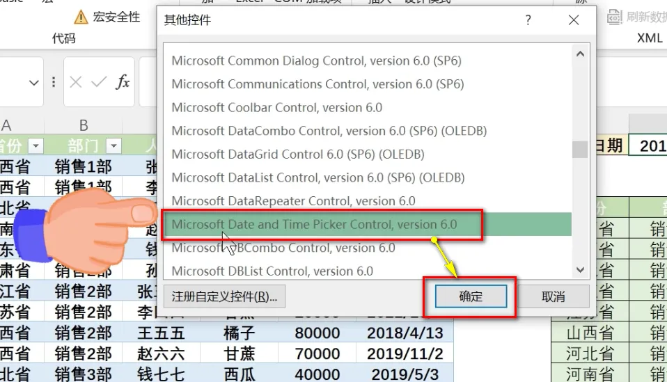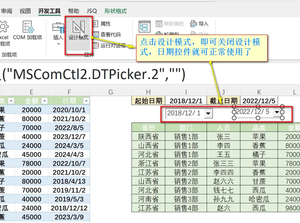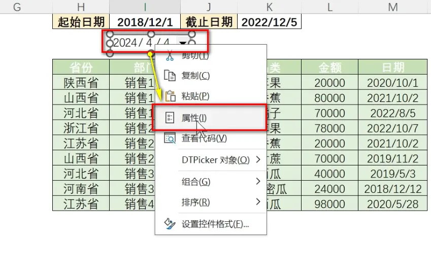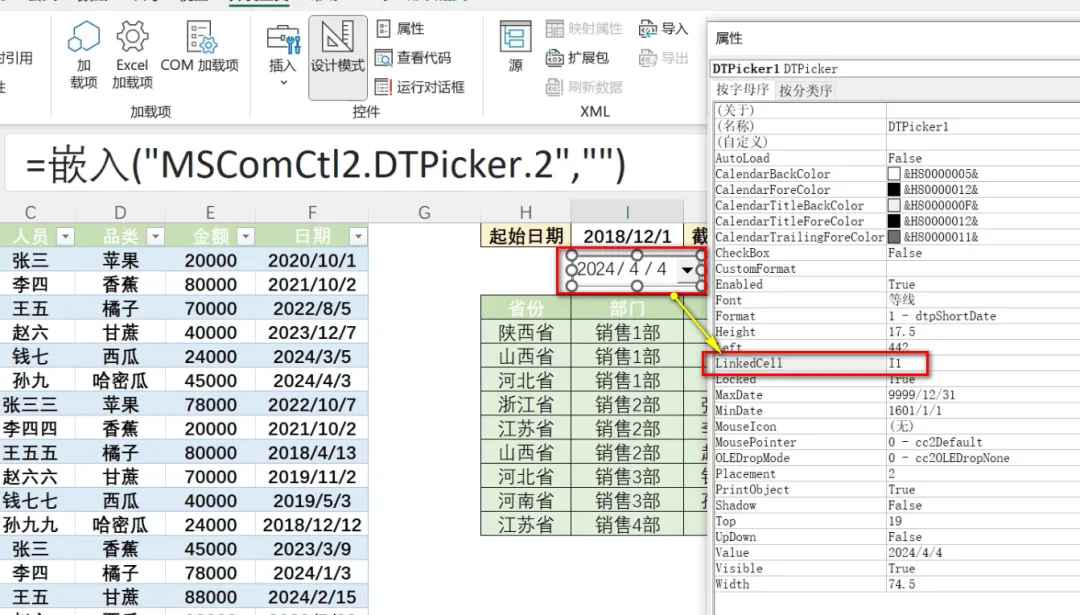 如下图,通过“开发工具”菜单--“插入”--“其他控件”--“Microsoft Date and Time Picker Control, version 6.0”,即可添加数据控件,然后再通过右键选择日期控件“属性”--“LinkedCell”处分别输入绑定单元格I1和K1--关闭“设计模式”。