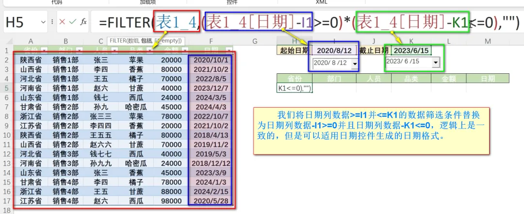 如上图,我们将日期列数据>=I1并<=K1的数据筛选条件替换为日期列数据-I1>=0并且日期列数据-K1<=0,逻辑上是一致的,但是可以适用日期控件生成的日期格式。