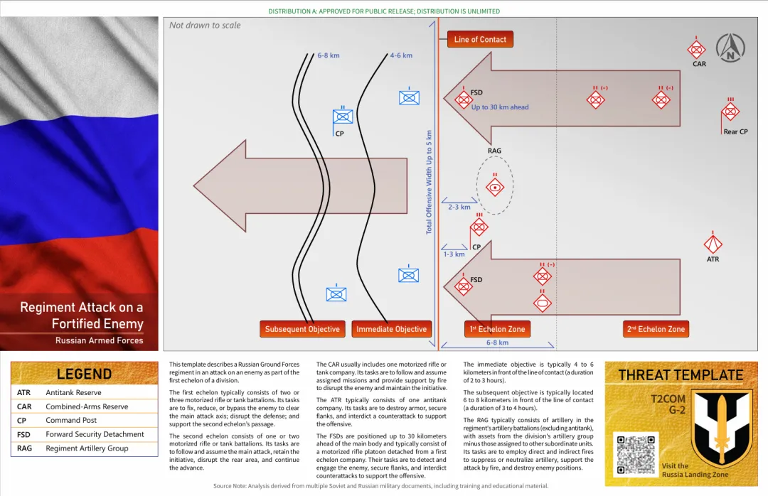 在现代高强度的阵地攻防战中,旅团级单位往往是决定战役走向的“拳头部队”。2026年4月,美军训练与条令司令部(T2COM G-2)发布关于“俄罗斯陆军团级部队对坚固设防之敌进攻”的战术模板,为我们精准剖析了俄式陆战学说。文件硬核拆解了俄军团级攻坚战的指挥控制、兵力配置与战术推演全过程,不仅详尽阐述了各梯队的兵力组成,更明确了其在突破、纵深、火力与预备队之间的严密分工。