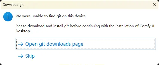 Please download and install git before continuing with the installation of ComfyUIDesktop.