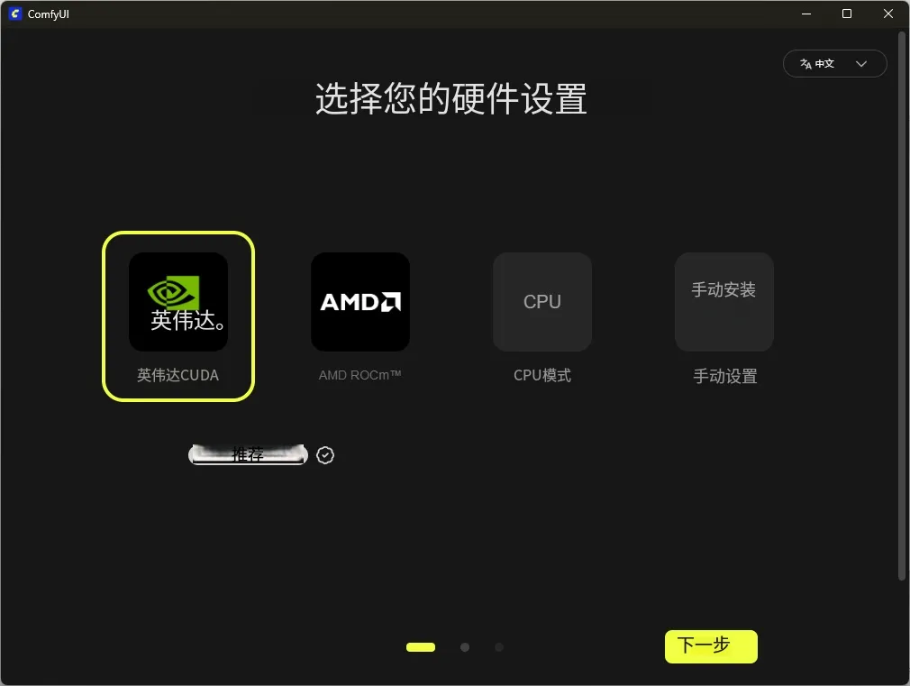 选择 CUDA 并处理驱动:N卡用户选英伟达 CUDA;若提示驱动版本过低(需 ≥580),用