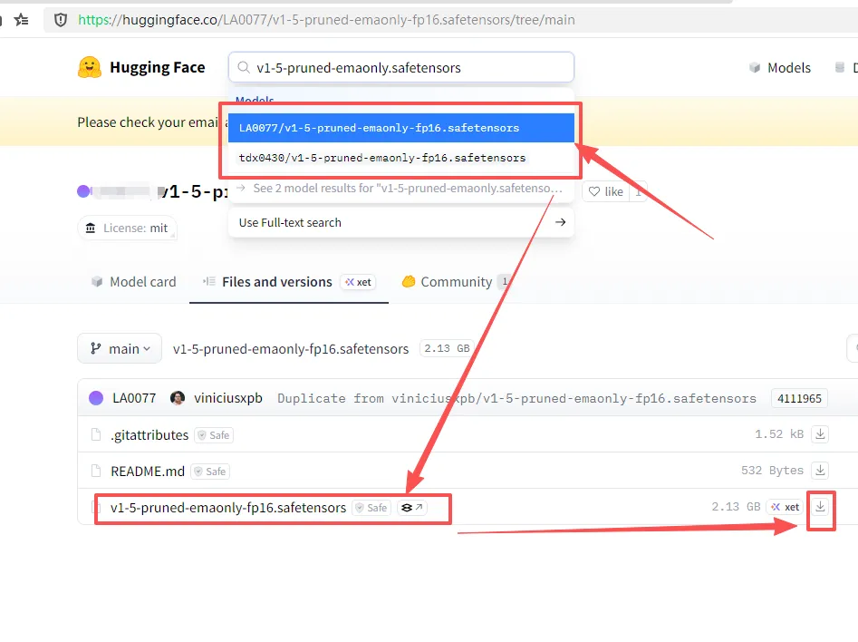 输入“v1-5-pruned-emaonly-fp16.safetensors” 可以 搜一个,
