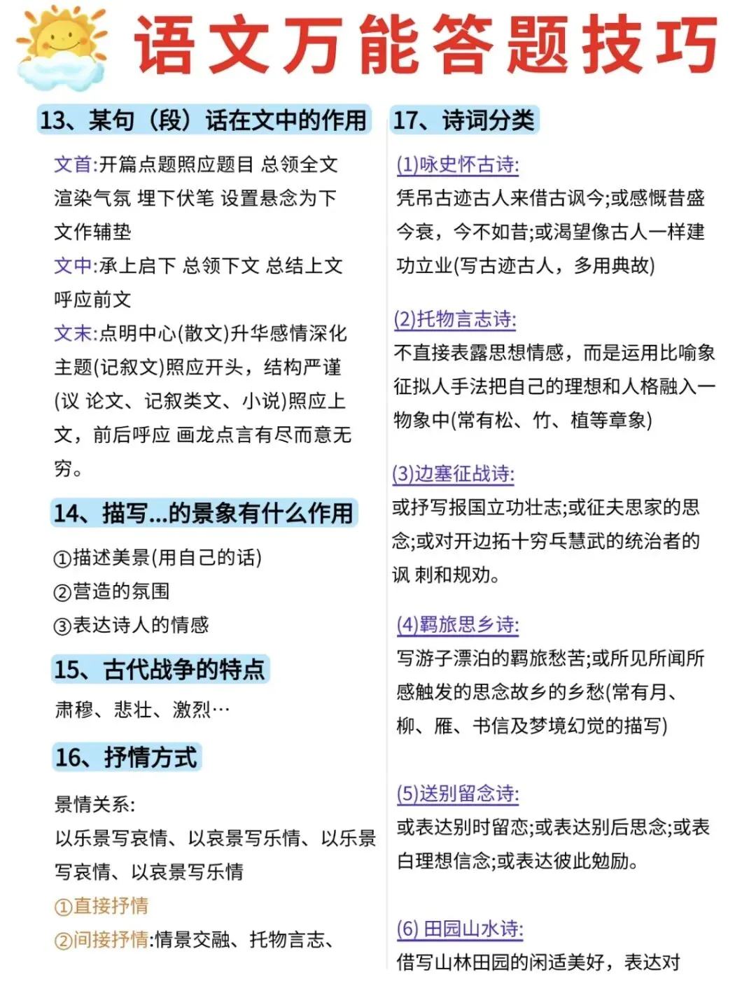 语文考试中,阅读理解、诗词鉴赏、小说分析常让同学们抓耳挠腮,明明读懂了文章,却总拿不到高分?别慌!今天就把这些“万能答题模板”整理成干货,帮你理清思路,告别“想到啥写啥”,让每一分都稳稳到手!