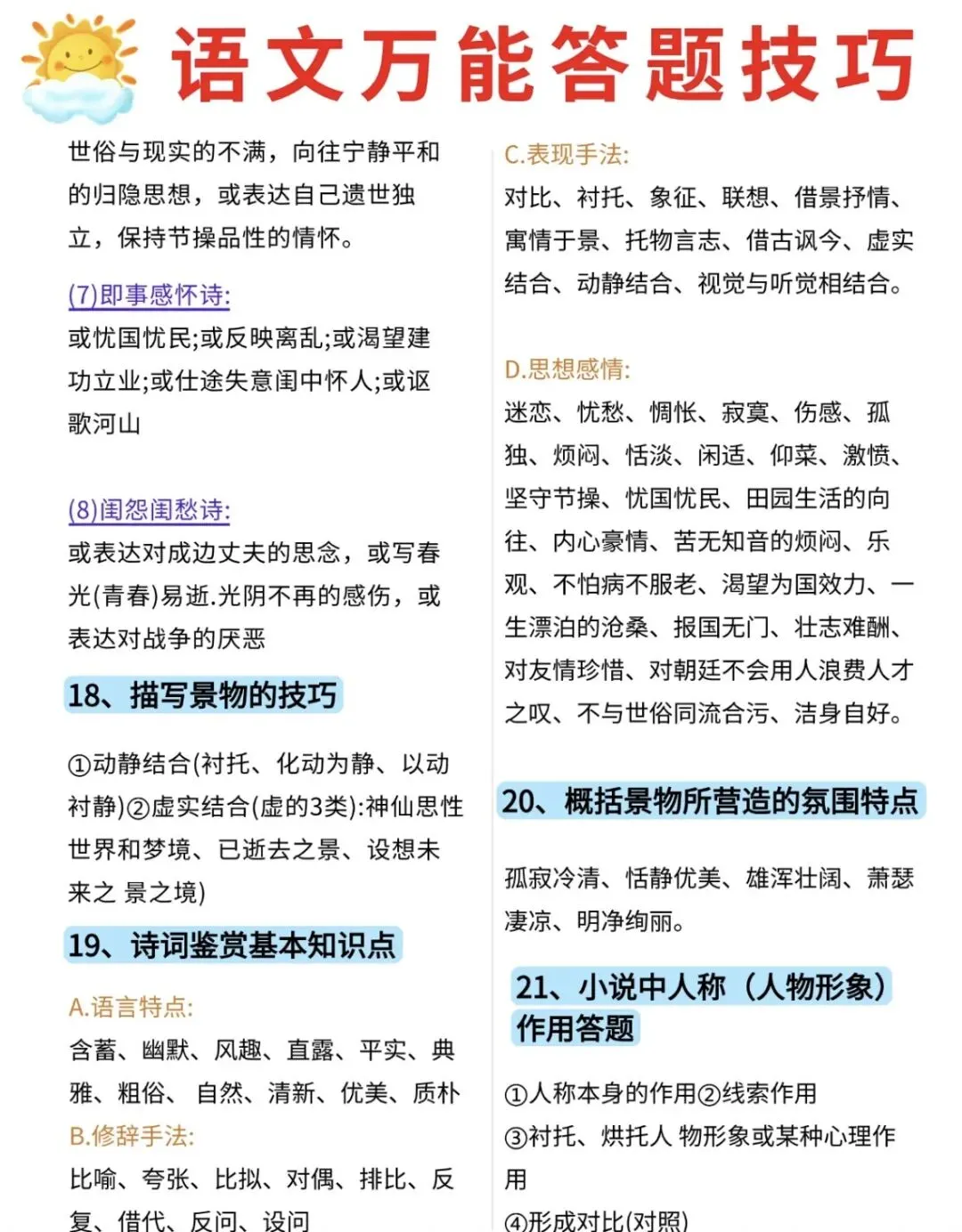 再从语言特点、修辞手法、表现手法、思想感情四个维度分析,比如借景抒情、托物言志、以乐景写哀情等,掌握这些术语,诗词题就能答得有章法、有深度。