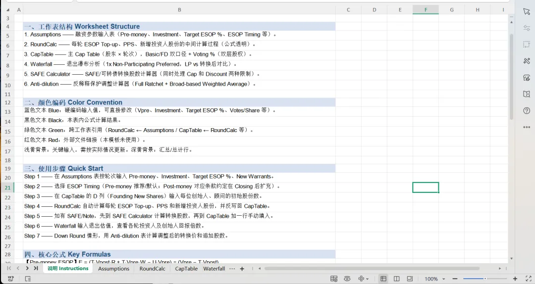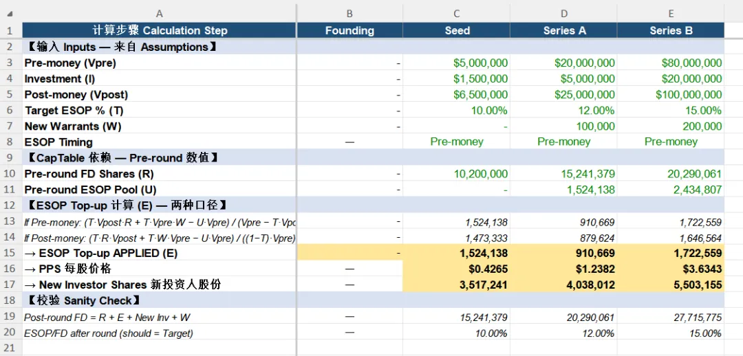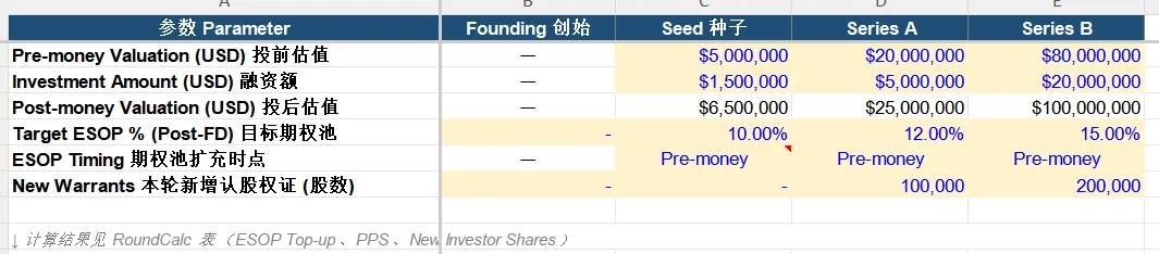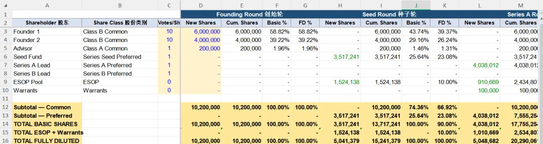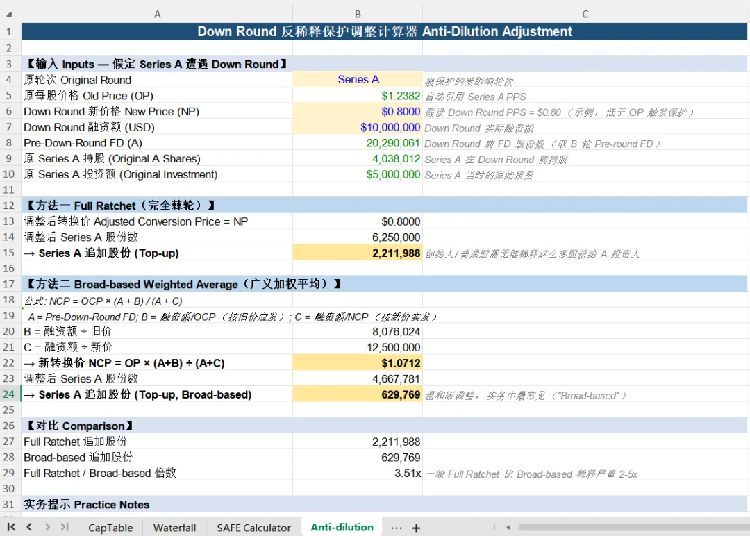 Captable模板在一个比较基础的模板上让AI不断修订/更正了几轮,生成了一个功能比较齐全的captable模板,欢迎使用/反馈修改意见。目前主要功能包括:1.创始人 / 投资人 / esop持股情况以及多轮融资信息;2.完全摊薄(Fully Diluted)口径与未摊薄口径列示;3.Warrants转股测算;4.反稀释测算(区分广义加权平均和完全棘轮口径);5.退出回报测算。各界面见下图,下载链接如下:captable模板下载