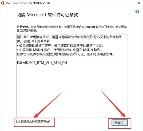 2、勾选【我接受此协议的条款】,点击【继续】。