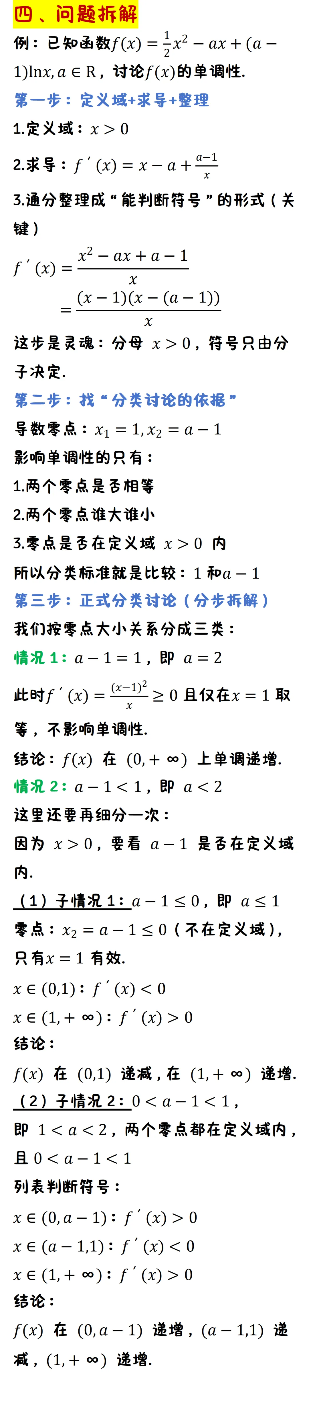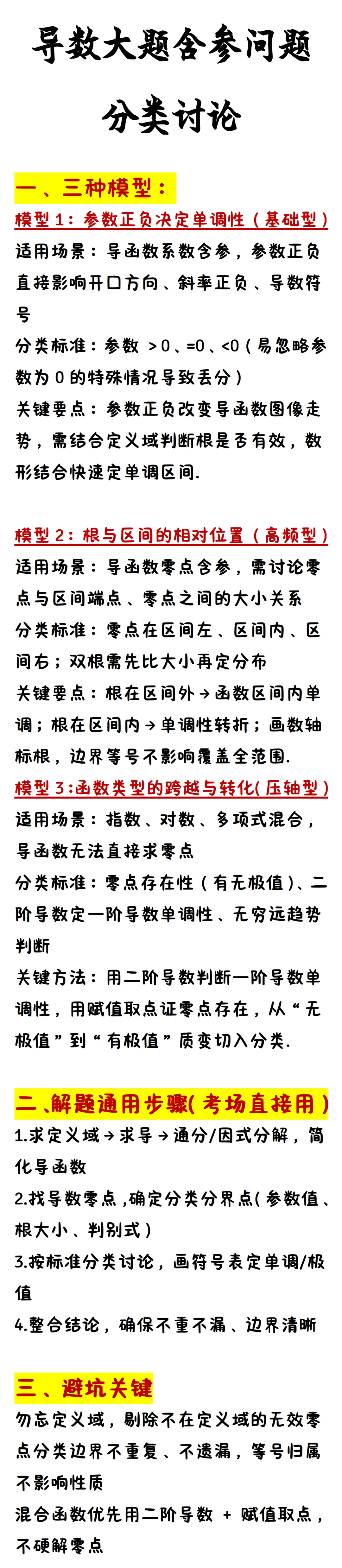 【解题模板】导数大题中含参问题的分类讨论了解我们解读教材教法,研究解题策略,推送知识干货,分享学习方法。品数学之道——数学知识归纳品数学之术——数学解题方法品数学之美——数学美图合集品数学之味——趣味数学漫谈(点击蓝字查看往期精彩)相关链接:【精品试卷】2026届全国各地“一模”试卷精选50套(wrod,可编辑打印)【3月试卷】2026届高三全国各地模拟卷70套【2月试卷】2026届高三全国各地模拟卷70套【1月试卷】2026届高三全国各地模拟卷70套【12月试卷】2026届高三全国各地模拟卷70套【11月试卷】2026届高三全国各地模拟卷70套【10月试卷】2026届高三全国各地模拟卷70套【9月试卷】2026届高三全国各地模拟卷70套【计算能力】高中数学计算题专练,15个专题,word版,有解析,可打印点击下方公众号名片,留意后续更新点击关注