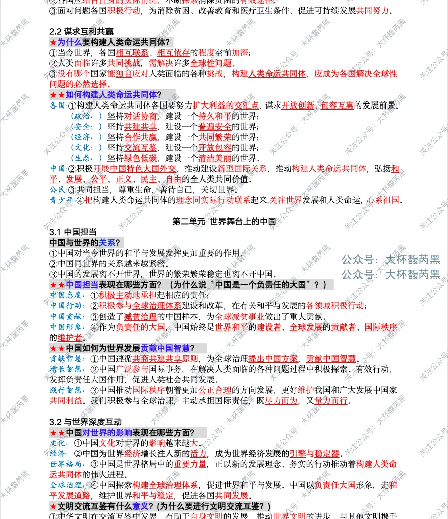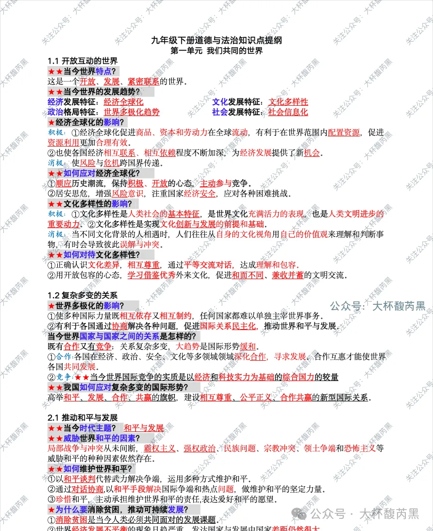 今天分享的是九下道德与法治期末考点背诵提纲,依然是精简五页纸!大题必拿下!九下内容复习重点要放在世界舞台上的中国上,提纲已经去掉不太考的内容,并根据考频标注了星级。