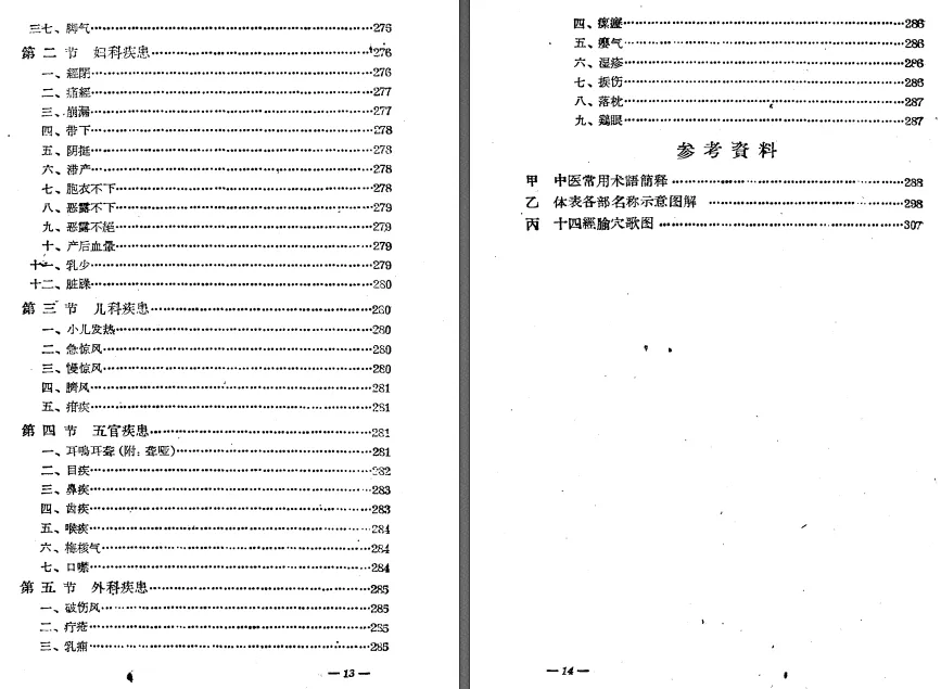 内科:中风、头痛、失眠、胃痛、痢疾; 骨伤:落枕、扭伤、肩周炎、腰痛; 妇儿:痛经、月经不调、遗尿、小儿惊风; 五官:耳鸣耳聋、牙痛、鼻炎、目疾; 外科:疔疮、乳痈、湿疹、瘰疬; 每病含病因→辨证→主穴→配穴→手法→疗程,配十四经腧穴分部主治图,便于临床参考。 - 附录:中医常用术语简释