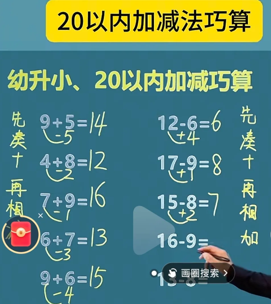 前几天,小妞姥爷在某音上给我推了一个“20以内速算巧算”的视频。感谢姥爷,但当时我没太在意。这周发现,小妞做20以内的进退位加减法时,还得掰着手指头数来数去,没法心算。究其原因,还是步骤太多,脑子容易乱。