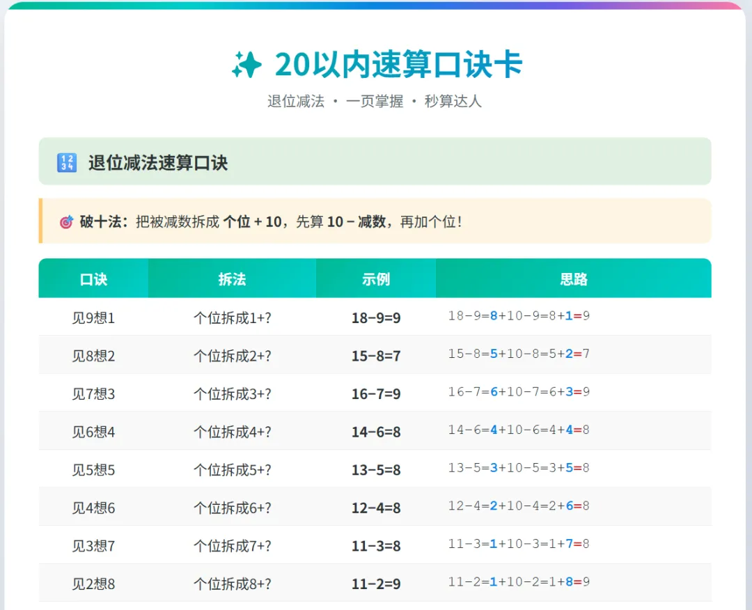 ✅ 掌握口诀 = 20以内退位减法秒算!🎉