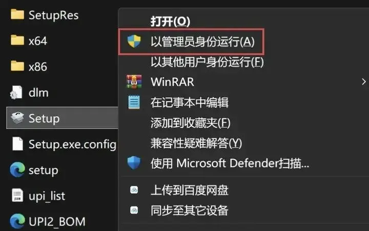 选中 Setup 安装程序,右键选择"以管理员身份运行"