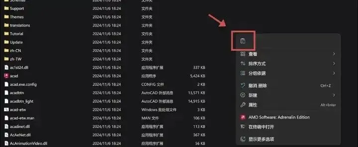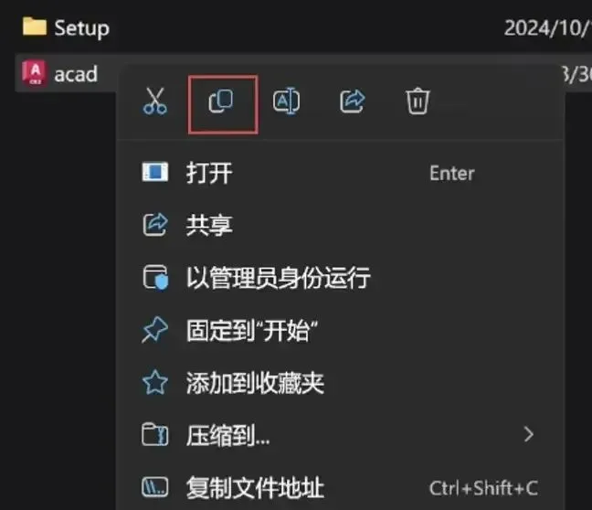 回到解压文件夹,找到 acad 文件并复制。如果没有该文件,说明被安全软件拦截了,请关闭防火墙后重新解压