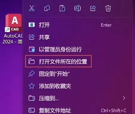 回到桌面,右键选中 CAD 2024 图标,选择"打开文件所在位置"