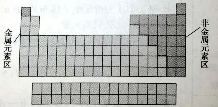 沿着周期表中硼、硅、砷、碲、砹、与铝、锗、锑、钋、之间画一条线,线的左边是金属元素(氢除外),线的右边是非金属元素。非金属元素要集中在元素周期表右上角的三角区内(如图)。