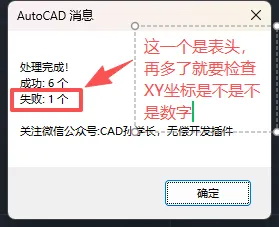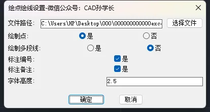 CAD批量绘点绘线标注,告别手动输入Excel坐标cad插件是高效运用CAD的灵魂--CAD孙学长希望孙学长的插件可以让各位朋友早下班、少加班、不熬夜!该cad插件免费获取方式在文末解决问题:根据excel坐标表批量绘制点、批量绘制线、支持是否标注编号、是否标注备注,备注可以是高程,可以是任何文字性的信息。类似展点效果。有两位朋友提出需求:excel表格形式:弹窗形式:运行结果提示:运行结果展示:如果点显示不清,可用PTYPE命令调整点样式:💡 适用场景:所有 CAD 二维绘图中图纸比例测算 + 比例文字标注的全流程操作。更多待朋友们发现的场景......命令HDHX(绘点绘线)展示效果如下: 已关注 关注 重播 分享 赞 视频详情 获取方式一(免费获取):互动后,孙学长择机分享【密享】链接,限制访问1人,有效期1天,需要及时保存。适合不着急使用的朋友。获取方式二(支持孙学长):赞赏。文末红色的“喜欢作者”。赞赏后自动回复加好友的二维码,可更快召唤孙学长,手动发送,无限制。需求可优先开发。(一般无需加好友,赞赏后会有消息通知提醒)关注CAD孙学长,无偿开发分享自写cad插件,关注不迷路!