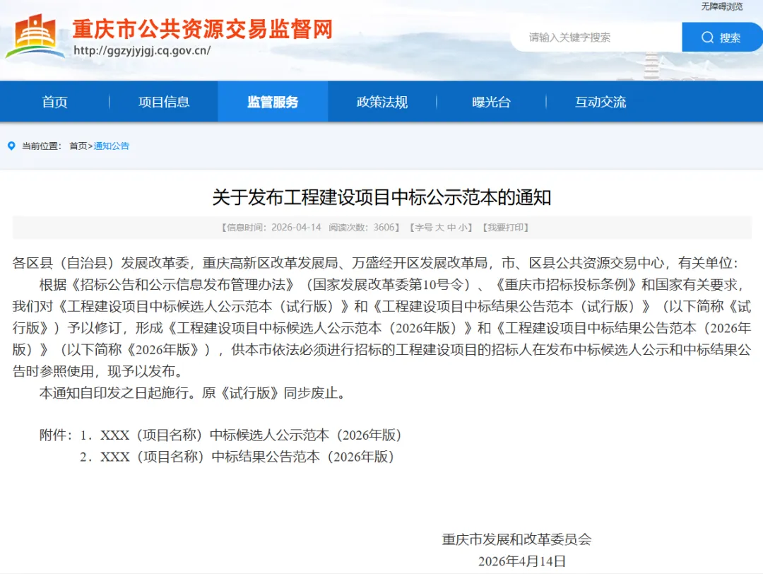 重庆的中标公示要“换模板”了,这两份新范本跟你有什么关系?重庆的中标公示要“换模板”了,这两份新范本跟你有什么关系?干招投标这行久了,有一个体会特别深:这个行业里,最容易被人忽略的,往往不是那些厚得像砖头一样的招标文件,而是开标之后挂在网上的那几页中标公示。很多人觉得,中标公示嘛,不就是告诉所有人“谁中标了”吗?格式不格式的,有什么关系?以前我也这么想。直到有一次,一个投标人拿着中标公示来找我,指着上面一个含糊的表述问:“这句话到底什么意思?我想提异议,但我连该找谁、在多长时间内提都不知道。”我才意识到,中标公示不是一张简单的“成绩单”,它是整个招投标流程里最后一个、也是最容易被忽视的法律文书。它写得好不好、规不规范,直接关系到投标人的知情权和异议权能不能落到实处。2026年4月14日,重庆市发改委发了一个通知,把这件事往前推了一大步。01 通知说了什么?两句话就能讲清楚这个通知的全名叫《关于发布工程建设项目中标公示范本的通知》,发布单位是重庆市发展和改革委员会,发布时间是2026年4月14日,施行时间是印发当天。核心内容很简单:废止了原来的《试行版》中标公示和公告范本,发布了《2026年版》新范本,要求全市依法必须招标的工程建设项目参照使用。我特意去看了附件里的两份新范本——《中标候选人公示范本(2026年版)》和《中标结果公告范本(2026年版)》。对比旧版,新范本的变化可以用一句话概括:格式更统一了,要素更明确了,投标人想知道的那些关键信息,被要求写得清清楚楚。哪些关键信息?第一,中标候选人的排序、名称、投标报价、工期、质量目标、项目负责人姓名及证书编号——这些信息被放在了最显眼的位置,格式统一成表格,一目了然。第二,提出异议的渠道和方式——不再是以前那种模棱两可的“如有异议请向招标人提出”,而是明确要求写清楚:招标人是谁、联系人是谁、联系电话是多少、甚至电子邮箱地址。这意味着投标人想提异议的时候,不用再去翻招标文件找联系方式,公示里就有。第三,中标候选人响应招标文件要求的资格能力条件——这项要求把“资格后审”的结果摆在了明面上,让所有参与投标的人都能看到,中标候选人到底凭什么资格中的标。第四,被否决投标的投标人名称、否决原因和依据——这一条我觉得最解渴。以前很多公示只写“XX公司被否决”,但不说为什么。投标人想知道自己为什么被废标,还得走质疑程序。现在新范本要求把否决原因和依据都写清楚,阳光下的操作,大家都看得到。02 为什么要换模板?旧版的问题出在哪有人可能会问:中标公示不就是个告知吗,有必要专门发文换模板吗?有必要。而且这次换模板,解决的恰恰是实务中困扰投标人很久的几个痛点。痛点一:公示信息太简略,投标人看不懂。旧版范本对公示内容的要求比较笼统,很多招标人就写个中标单位名称和报价,其他一概不提。投标人看完公示,只知道谁中标了,但不知道为什么是他中标、评标过程发生了什么、自己如果有异议该找谁。这种公示,起不到“公示”应有的监督作用。痛点二:异议渠道不明确,投标人维权无门。根据《招标投标法实施条例》第五十四条,投标人对评标结果有异议的,应当在中标候选人公示期间提出。但现实是,很多公示上根本没有写清楚向谁提、怎么提、联系方式是什么。投标人想提异议,还得自己去查招标人的电话,打过去还不一定找得到对的人。等终于找到人了,公示期可能已经过了。新范本把异议渠道作为必填项,就是在堵这个漏洞。痛点三:否决原因不透明,被废标的投标人一头雾水。这是实务中投诉量最大的问题之一。投标人辛辛苦苦准备标书,结果在公示里看到自己被否决了,但不知道原因。是资格不够?是格式不对?还是报价有问题?不知道。只能通过正式质疑程序去问,流程走下来少说几天,多则一两周。新范本要求公开否决原因和依据,等于把评标委员会的一部分工作成果主动公开了,减少了信息不对称。痛点四:资格后审的结果不公开,失去了“后审”的意义。资格后审是开标之后才审查投标人的资格条件,但审查结果在很多公示里是看不到的。其他投标人不知道中标候选人到底具不具备资格条件,公众也无法监督。新范本要求公示“中标候选人响应招标文件要求的资格能力条件”,等于把后审结论也公开了,让资格后审真正起到了“审”的作用。03 对投标人来说,这不止是“看看而已”我知道,大部分投标人看中标公示的心态是:看看自己中了没,没中就关掉,该干嘛干嘛去。但新范本发布之后,我建议你养成一个新的习惯:不管中没中,都把公示从头到尾看一遍。为什么?第一,看否决原因,知道自己“死”在哪。新范本要求公示被否决的投标人名称、否决原因和依据。如果你是那个被否决的投标人,这条信息就是你复盘的第一手资料。是因为财务报表格式不对?是因为项目经理社保期限不够?是因为检测报告没盖章?搞清楚原因,下次投标就不会在同一个地方摔倒。第二,看中标候选人的资格条件,了解对手的实力。公示里会写清楚中标候选人的资格能力条件——他有什么资质、项目经理是什么级别、业绩是什么。这些都是公开信息,是你了解竞争对手、判断自己报价策略的重要参考。这次他比你分高,高在哪?下次你怎么调